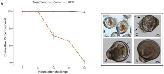 Effect of challenge with Vibrio coralliilyticus RE22 on C. virginica larvae. (A) Cumulative percent mortality +/− standard error in oyster larvae after 6–20 h of challenge with 5 × 105 CFU mL−1 of RE22 (n = 6 experiments). Mortality was first observed at 14 h after challenge, and rapidly increased thereafter. (B) Actively swimming healthy control larvae. (C) Larvae showing clumping of the cilia 6 h after challenge. (D) Moribund larva with retracted cilia showing reduced movement at 9 h after challenge. (E) Dead larva with empty shells at 14 h after challenge.