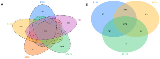 Comparison of differentially expressed genes in probiotic treatments. (A) Venn Diagram of shared and unique differentially expressed genes for larvae exposed to Vibrio coralliilyticus RE22 (6 h), probiotic (Bacillus pumilus RI0-695 and Phaeobacter inhibens S4) at 6 h and 24 h in laboratory experiments (n = 3). (B) Venn diagram comparing number of differentially expressed genes in probiont RI pre-treated larvae at 5, 12, and 16 d post-fertilization (4, 11, and 15 d of RI exposure) as compared to the respective untreated control in a hatchery (n = 3 tanks per treatment).