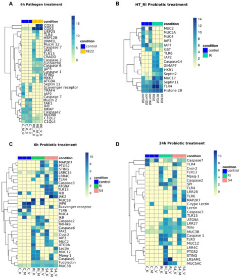 Several transcripts related to antiviral pathways including stimulator of interferon genes protein-like (sting; all bacterial treatments) and some members of the JAK-STAT pathway (jak2 (tyrosine-protein kinase JAK2-like); S4 and RE22) were upregulated in response to bacterial exposures (Figure 4 and Figure 5). Differentially expressed transcripts corresponding to ubiquitin carboxyl-terminal hydrolase 25-like isoform X3 (usp25) were only seen in response to RE22. Moreover, several transcripts related to programmed cell death pathways were shown to be differentially expressed in larvae exposed to pathogen or probionts RI and S4 as compared to control larvae. These included upregulation of transcripts corresponding to autophagy related gene atg9a (autophagy-related protein 9A-like) and modulation (a combination of upregulation and downregulation, depending on the treatment and time) of several transcripts associated with the apoptosis pathway coding for death domain-containing protein CRADD-like (death domain-containing protein CRADD-like), initiator and executioner caspases, GTPase of the immune-associated protein 7 (GIMAP7, only in response to RI exposure in the hatchery), and several types of baculoviral inhibitor of apoptosis (IAP) repeat-containing proteins (Inhibitor of apoptosis protein) (Figure 4 and Figure 5). In particular, expression of caspase1, a key component of the inflammasome, was highly and consistently upregulated in all three bacterial treatments (Figure 4). Moreover, prostaglandin G/H synthase 2-like (PTGS2), important in inflammation, was also highly upregulated in all probiotic treatments except S4_24h.