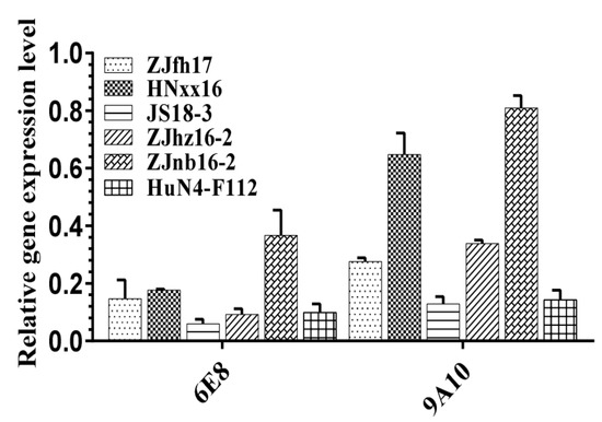 6E8 and 9A10 inhibit different PRRSV strains. PAMs and Marc-145 were preincubated with 50 μg/mL mAb for 1 h, followed by the inoculation with PRRSV strains individually, including ZJfh17, HNxx16, JS18–3, ZJnb16–2, ZJhz16–2, and HuN4-F112. Cells were collected at 24 hpi and relative PRRSV N mRNA levels were quantified by real-time PCR. Relative changes of mRNA were compared to the PRRSV infection group without antibody treatment. GAPDH was detected as the internal reference.