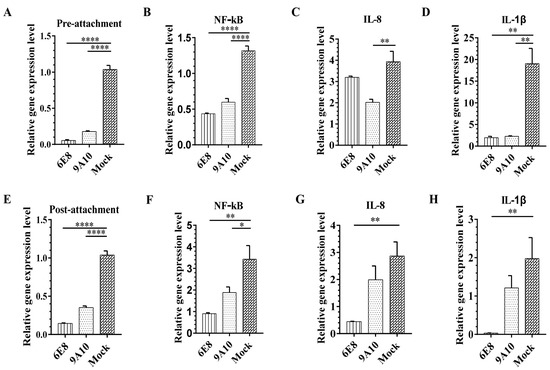 PRRSV replication triggers the activation of NF-κB, ERK1/2, and p38MAPKs, leading to the release of proinflammatory cytokines such as IL-1β, IL-8, and IL-6. As shown in Figure 4, mRNA expression of NF-κB, IL-1β, and IL-8 significantly decreased with either pre- or post-attachment antibody treatment at 100 μg/mL individually. The results confirmed that CD163 mAbs (6E8 and 9A10) effectively inhibit the PRRSV related NF-κB pathway and prevent cellular pathogenesis.
