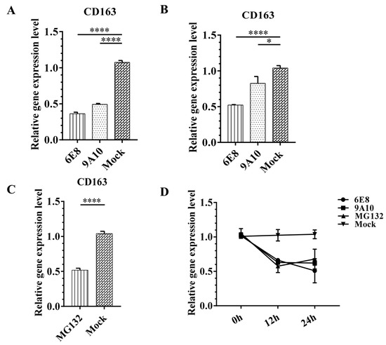 9A10 and 6E8 mAbs suppress CD163 transcription. Total RNA was extracted to evaluate mRNA expression of CD163 in PAMs (A) and Marc-145 (B). Cells were mock treated or treated with mAbs (100 μg/mL) for 1 h, and then cultured for 24 h. (C) MG132 (20 μg/mL) inhibited CD163 transcription in Marc-145. (D) Time-coursed suppression in CD163 transcription with mAbs or MG132. GAPDH was detected as the internal reference. Experiments were performed in triplicate and data are shown as mean ± SD. Statistical significance is indicated as * (p < 0.05); **** (p < 0.0001).