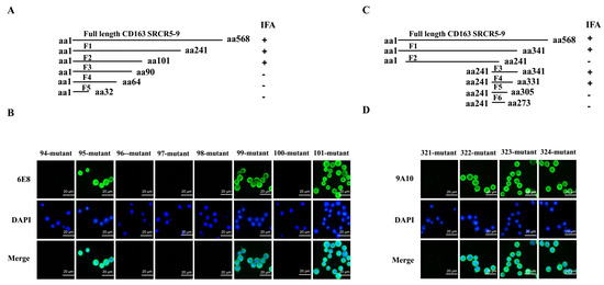 Fine mapping of epitopes recognized by 6E8 and 9A10. Schematic diagram of various CD163 SRCR5–9 truncated fragments for epitope mapping with 6E8 (A) and 9A10 (C). SRCR5–9 fragments 1 to 5 and subfragments were expressed in recombinant baculovirus in Sf9 insect cells and screened with individual mAb in IFA. (B,D) IFA with mAbs in insect cells expressing point mutated Ac-CD163 SRCR5–9. Alanine substitutions at aa90-aa101 (B) and aa305-aa331 (D) of Ac-CD163 SRCR5–9 were performed individually.