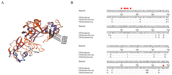 With CD163 structure analysis, 570SXDVGXV576 and Q797 were found to be located on the surface of CD163, which facilitates the interaction with either virus RBDs or antibodies (Figure 7A). As shown in sequence alignment, the two epitopes identified are conserved among different species, including pigs, humans, and monkeys (Figure 7B), suggesting the key roles of these residues in maintaining CD163 function.