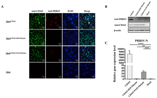 To further study the function of residues recognized by mAbs in PRRSV infection, CD163s with or without mutated epitopes were overexpressed in 3D4 cells, in which endogenous CD163 expression is absent. Specifically, 3D4 cell lines designated 3D4CD163, 3D4CD163−6E8-mutant, and 3D4CD163−9A10-mutant were generated via infection with recombinant lentiviruses encoding porcine full-length CD163, CD163–6E8-mutant and CD163–9A10-mutant, respectively. First, expression of CD163 and mutants in 3D4 was confirmed by IFA (Figure 8A). 3D4CD163, 3D4CD163−6E8-mutant, and 3D4CD163−9A10-mutant were infected with PRRSV at MOI of 1, while wild type 3D4 served as control. As shown in IFA, 3D4CD163 supported PRRSV replication while original 3D4 failed to. Notably, upon PRRSV inoculation, only sporadic cells were infected in 3D4CD163−9A10-mutant, while no infection was detected in 3D4CD163−6E8-mutant. In Western blotting, PRRSV infection were observed in 3D4CD163 at 24 h post-infection, while no virus specific signal was detected in either 3D4CD163-mutants or wild type 3D4 (Figure 8B). Similarly, in qPCR, no PRRSV replication was observed in 3D4CD163−6E8-mutant, while robust viral signals were obtained from 3D4CD163 (Figure 8C). Slight PRRSV expression was detected in 3D4CD163−9A10-mutant, indicating any substitution in epitopes of 6E8 and 9A10 abolishes or significantly hampers PRRSV infection. For the first time, the key residues in CD163 for PRRSV infection have been identified.