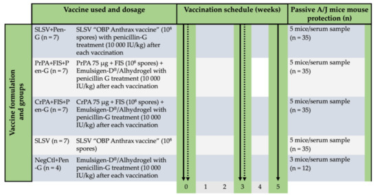 The use of non-living anthrax vaccine (NLAV) candidates would be a novel approach due to the various benefits such as eliminating the danger of handling spores during production, standardising production, avoiding batch variation and environmental contamination, use of improved adjuvants, and simultaneous use with antibiotics treatment [18,19,20]. The human anthrax vaccines, AVP and AVA, are examples of NLAVs that were developed using protective antigen (PA) as the key antigen [21]. These older-generation human anthrax vaccines required numerous boosters to provide sufficient immunity as well as the remnant of lethal factor present with PA harvested from the culture supernatant [22,23,24,25,26]. Thus, recombinant PA (rPA) offers a pure and uncontaminated antigenic component, which can be combined with other B. anthracis components to enhance immunity. These components include surface layer proteins [27], exosporium basal layer protein (BxpB also known as ExsF) [2,28], Bacillus collagen-like anthracis (BclA) [29,30,31,32], and/or formalin-inactivated B. anthracis spore (FIS) [33,34,35,36,37,38,39]. The idea was to combine rPA which produces anti-toxin antibodies to prevent the production of toxins in vivo with B. anthracis spore components to enhance anti-spore antibodies, thus preventing spore germination [17]. In previous studies, goats were vaccinated using rPA, BclA, and FIS adjuvanted with a lipopeptide in a three-step vaccination schedule and protection was shown using either the passive A/J mouse challenge model or lethal virulent B. anthracis challenge in goats [36,38]. The immunogenic findings showed that rPA and FIS stimulate a better immune response in the goats compared to BclA and that a two-step vaccination schedule might be sufficient [36,38,40]. A three-step vaccination schedule of rPA, BclA, and FIS was also administered simultaneously with Pen-G to goats and the immune response showed similar antibodies titres against PA and FIS in NLAV plus Pen-G vaccinated group to the animal group vaccinated twice with SLSV [37]. However, the protective efficacy of the antibodies from goats vaccinated with PA, BclA, and FIS and simultaneous treatment with penicillin-G was not investigated. Recently, a two-step vaccination schedule of NLAV candidates (consisting of either purified and crude rPA combined with the FIS and adjuvants) and SLSV administered to cattle showed comparable immunogenicity and protective efficacy induced by the purified rPA + FIS formulation and the standard SLSV [41].