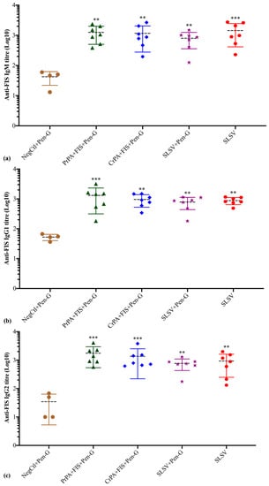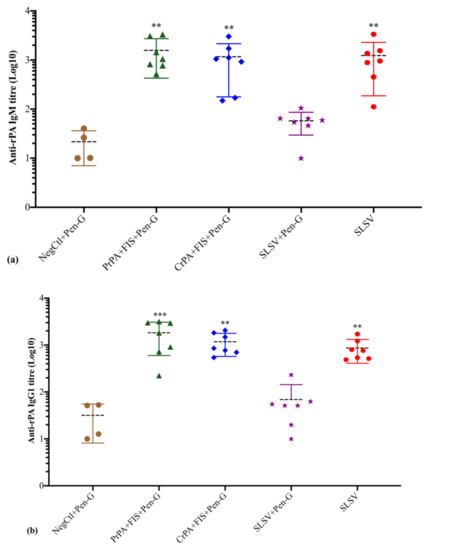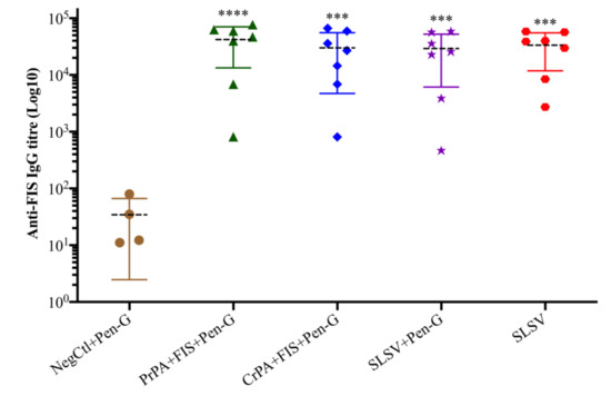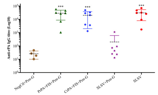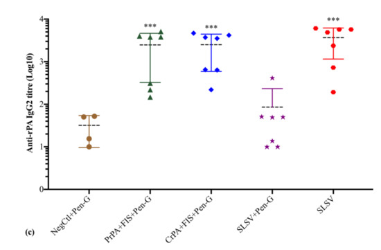 Both the PrPA + FIS + Emulsigen-D®/Alhydrogel® plus Pen-G and CrPA + FIS + Emulsigen-D®/Alhydrogel® plus Pen-G stimulated a significant IgG response against rPA, at week 3 (three weeks after the first vaccination), whereas the anti-rPA IgG titres were insignificant among the animal groups that were vaccinated with SLSV + Pen-G as well as SLSV alone at week 3 (Table S1). At week 5 (two weeks after the second vaccination), the IgG titres against rPA increased significantly for PrPA + FIS + Emulsigen-D®/Alhydrogel® plus Pen-G, CrPA + FIS + Emulsigen-D®/Alhydrogel® plus Pen-G and SLSV vaccinated groups, while SLSV + Pen-G titres increased but not significantly (Table S1, Figure 2). In addition, the anti-FIS IgG titres for PrPA + FIS + Emulsigen-D®/Alhydrogel® plus Pen-G, CrPA + FIS + Emulsigen-D®/Alhydrogel® plus Pen-G, SLSV plus Pen-G and SLSV at week 3 and week 5 increased significantly (Table S1, Figure 3). Both anti-rPA and anti-FIS titres were compared to pre-vaccination titres (week 0).