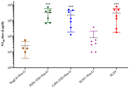 The neutralising antibody titres (NT50) were low after the first vaccination at week 3 without any significant increase for all vaccine groups, but the NT50 increased significantly for PrPA + FIS + Emulsigen-D®/Alhydrogel® plus Pen-G, CrPA + FIS + Emulsigen-D®/Alhydrogel®plus Pen-G and SLSV vaccinated groups after the second vaccination at week 5. However, there was no significant increase observed in NT50 titres among the vaccine groups immunised with SLSV and treated with Pen-G after the first and second vaccination (Table S1, Figure 6).