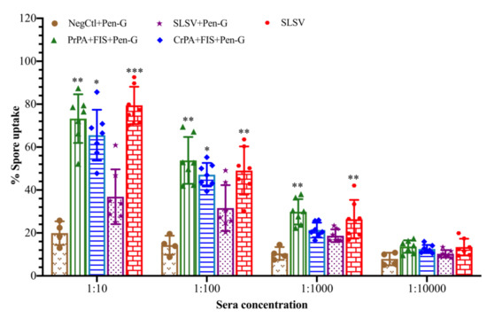 The ability of the vaccine-induced antibodies collected at week 5 to opsonise and enhance phagocytosis of B. anthracis spores by macrophages (RAW264.7) was measured. The highest level of spore uptake by the macrophage at the sera dilution of 1:10 was 79% for SLSV, 73% for PrPA + FIS + Emulsigen-D®/Alhydrogel® plus Pen-G and 61% for CrPA + FIS + Emulsigen-D®/Alhydrogel® plus Pen-G, whereas an insignificant level of spore uptake by macrophages was recorded for SLSV + Pen-G (37%) and NegCtl (20%) (Figure 7). A significant spore uptake by macrophages among cattle groups vaccinated with PrPA + FIS + Emulsigen-D®/Alhydrogel® plus Pen-G, and SLSV in dilutions of 1:10, 1:100, 1:1000 was observed, whereas CrPA + FIS + Emulsigen-D®/Alhydrogel® plus Pen-G vaccine group showed significant spore uptake at the sera dilution of 1:10 and 1:100 only. The macrophages spore uptake across all vaccination groups was compared to the level of spore uptake by negative control sera.