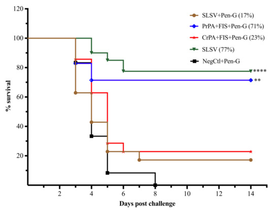 Mice survival curve following passive in vivo transfer of purified IgG from sera from cattle to A/J mice. The A/J mice were lethally challenged with approximately 2.16 × 105 B. anthracis 34F2 spores. The polyclonal IgG are from sera of cattle vaccinated twice (week 0 and 3) with either PrPA + FIS + Emulsigen-D®/Alhydrogel® plus Pen-G, CrPA + FIS + Emulsigen-D®/Alhydrogel® plus Pen-G, SLSV plus Pen-G, SLSV alone groups and NegCtl groups (Emulsigen-D®/Alhydrogel® plus Pen-G). The survival rate in Log-rank (Mantel–Cox) test was compared to NegCtl group. The significant values between groups are presented as **** p < 0.0001, *** p < 0.001, ** p < 0.01. Purified recombinant protective antigen: PrPA; Crude recombinant protective antigen: CrPA; Formalin inactivated Bacillus anthracis spores: FIS; Penicillin-G: Pen-G; Sterne live spore vaccine: SLSV; Negative control: NegCtl (Emulsigen-D®/Alhydrogel® plus Pen-G).