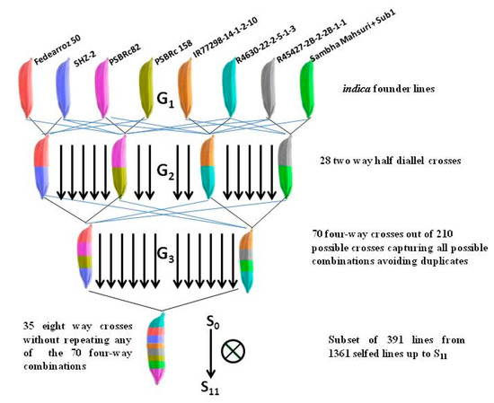 - Scott, M.F.; Ladejobi, O.; Amer, S.; Bentley, A.R.; Biernaskie, J. Multi-parent populations in crops: A toolbox integrating genomics and genetic mapping with breeding. Heredity 2020. [Google Scholar] [CrossRef]