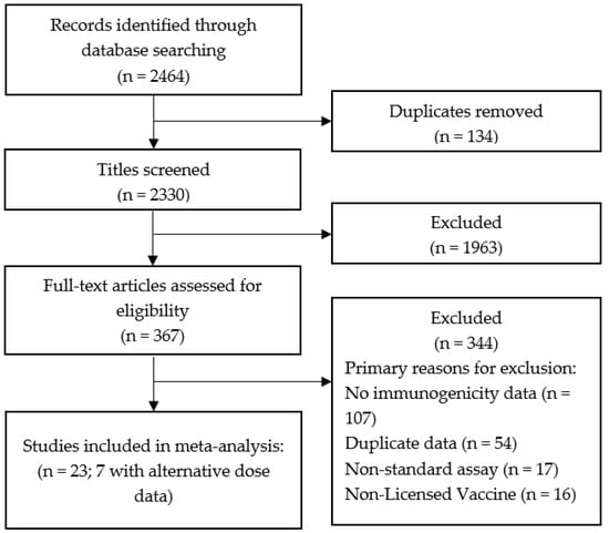 We identified 2464 studies using the search criteria (Figure 1). After removing duplicates and screening titles and abstracts, 367 studies were included for full-text review. Of these, 344 were excluded from the present analysis. The most common reasons for exclusion were lack of relevant immunogenicity data (107), duplicate or previously reported data (54), using an assay without a published conversion factor for international units (17), or trials using a non-licensed vaccine (16). Of note, three single dose and/or extended interval studies were excluded from the meta-analysis, two due to using an assay without a published conversion factor for international units [23,24], and one due to lack of available GMT data [25]. Standard dose studies were excluded if there were no available alternative schedule comparison data.