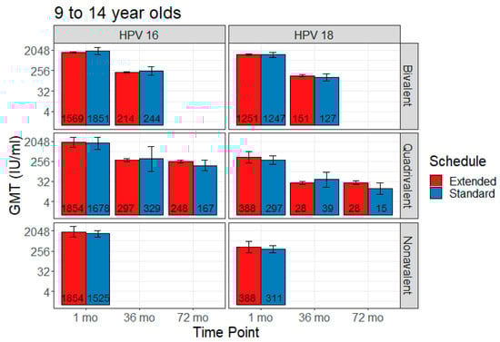 - Lamontagne, D.S.; Thiem, V.D.; Huong, V.M.; Tang, Y.; Neuzil, K.M. Immunogenicity of quadrivalent HPV vaccine among girls 11 to 13 years of age vaccinated using alternative dosing schedules: Results 29 to 32 months after third dose. J. Infect. Dis. 2013, 208, 1325–1334. [Google Scholar] [CrossRef][Green Version]
