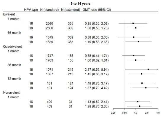 Forest plot of GMT ratio of extended interval versus standard schedule (with 0.5 indicating the non-inferiority cut-point—i.e., those with lower bounds greater than 0.5 are considered to meet non-inferiority criteria), by vaccine, human papilloma virus (HPV) subtype, time point, and age group.