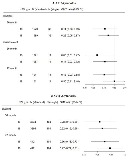 Three studies contributed to the single dose data and 14 to the comparison data, including two contributing to both. Single dose data were only available for the bivalent and quadrivalent vaccines, both of which had data at 36 months and 72 months post-first dose. Quadrivalent vaccine data were limited to the 9–14 age range, while bivalent vaccine data were available for both 9–14 and 15–26 ranges (although not at all time points). Figure 4 shows comparisons in pooled GMT, and Figure 5 shows GMT ratios and the non-inferiority analysis. Non-inferiority of single dose compared to standard dose was not demonstrated for either vaccine for both subtypes in relation to all time points and age groups compared.