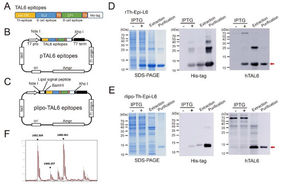 Figure 1. Characterization of recombinant non-lipidated (rTh-Epi-L6) and lipidated (rlipo-Th-Epi-L6) polyepitope vectors and proteins. (A) Epitopes of TAL6. The epitopes of TAL6 which trigger different immune cell response were sequentially combined with a HisTag sequence at the C-terminus. Pan-DR, helper T epitope; EL2, extracellular loop of TAL6; TM, transmembrane sequence (AAALLMLLPAFV); EP1, B cell epitope. (B) Plasmid pTAL6 was constructed by inserting the TAL6 epitopes into vector pET22b for production of the rTh-Epi-L6 protein. (C) Plasmid plipo-TAL6 was constructed by adding the D1 sequence to the pTAL6 vector for production of the rlipo-Th-Epi-L6 protein. (D) rTh-Epi-L6 expression and purification were monitored by reducing SDS-PAGE (left) and Western blotting with anti-HisTag (middle) and TAL6 (right) antibodies. (E) rLipo-Th-Epi-L6 expression and purification were monitored by reducing SDS-PAGE (left) and Western blotting using anti-HisTag (middle) and TAL6 antibodies (right). (F) Mass spectrometry analysis of rlipo-Th-Epi-L6. After the digestion of rlipo-Th-Epi-L6 with trypsin, the sample was analyzed by MALDI-TOF. The spectrum showed 3 peaks with m/z values of 1452, 1466 and 1480, corresponding to the expected mass differences for a lipidated peptide.