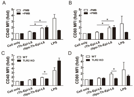 Figure 2. rLipo-Th-Epi-L6 activates bone marrow-derived dendritic cells (BM-DCs). (A,B) BM-DCs from wild-type mice were cultured in medium supplemented with rTh-Epi-L6 (50 nM), rlipo-Th-Epi-L6 (50 nM), or LPS (0.1 μg/mL), in the presence or absence of polymyxin B (PMB; 30 μg/mL). After a 24-h incubation, the expression of the DC surface markers CD40 (A) and CD80 (B) was analyzed using flow cytometry. The experiments were performed in triplicate, and the mean fluorescence intensity (MFI) of the cells cultured in medium alone was defined as 1. (C,D) BM-DCs isolated from wild-type and TLR2 knockout (TLR2 KO) mice were cultured in medium supplemented with rTh-Epi-L6 (50 nM), rlipo-Th-Epi-L6 (50 nM) or LPS (0.1 μg/mL), and then DC surface markers CD40 (C) and CD80 (D) were analyzed using flow cytometry. Data are presented as the means ± SEM of at least three independent experiments. * p < 0.05 by t-test.