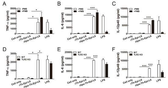 Figure 3. rLipo-Th-Epi-L6 stimulates bone marrow-derived dendritic cells (BM-DCs) to secrete cytokines. (AC) Cytokine TNF-α (A), IL-6 (B), and IL-12p40 (C) secretion by DCs was stimulated by rlipo-Th-Epi-L6. BM-DCs were cultured with rTh-Epi-L6 (50 nM), rlipo-Th-Epi-L6 (50 nM), or LPS (0.1 μg/mL) in the presence or absence of polymyxin B (PMB; 30 μg/mL). After a 24-h incubation, the supernatants were harvested and analyzed for cytokine production by ELISA. (DF) Cytokine TNF-α (D), IL-6 (E) and IL-12p40 (F) secretion by DCs isolated from wild-type and TLR2 knockout (TLR2 KO) mice was stimulated by rlipo-Th-Epi-L6. Data are presented as the means ± SEM of at least three independent experiments. * p < 0.05, *** p < 0.001 by t-test.
