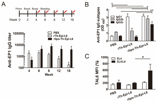 Figure 4. Immunization with rlipo-Th-Epi-L6 induced higher levels of anti-Ep1 antibody and Th1 immunity. (A) The immunization schedule in C57BL/6 mice (n = 6, per group) involving 3 injections (1 prime and 2 boosts) at 2-week intervals. Serum samples were collected from immunized mice at the indicated time points (red arrows) after the first immunization. Anti-EP1 IgG titers were determined using ELISA. (B) The subtypes of anti-EP1 IgG were determined. (C) The ability of immunized mouse serum to recognize TAL6 on cancer cell surface, depicted as the mean fluorescence intensity (MFI). The data are presented as the mean ± SEM of triplicate samples. * p < 0.05, ** p < 0.01 by t-test.
