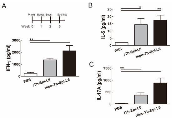 Figure 5. Immunization with rlipo-Th-Epi-L6 protein induced higher levels of cytokine release. (AC) The immunization schedule in C57BL/6 mice (n = 6, per group) involving injection of recombinant proteins 3 times at 1-week intervals. Seven days after the final immunization, mice were sacrificed, and splenocytes were isolated from the spleens and plated at a density of 5 × 105 cells/well in 24-well plates. The cells were incubated with 10 μg/mL pan-DR peptides for 4 days and then analyzed for secreted cytokines. The supernatants were collected, and the levels of IFN-γ (A), IL-5 (B), and IL-17A (C) were measured by ELISA. Bars and error bars show the mean ± SEM. * p < 0.05, ** p < 0.01 by t-test.