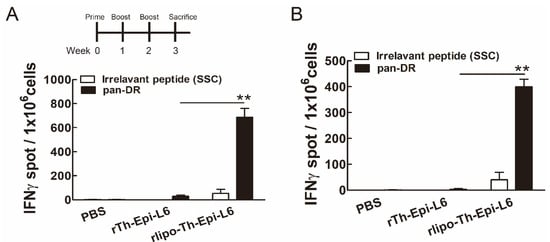 Figure 6. Immunization with rlipo-Th-Epi-L6 induced higher levels of pan-DR-specific IFN-γ-secreting cells. (A,B) The immunization schedule in C57BL/6 mice by injecting indicated recombinant proteins 3 times at 1-week intervals. n = 6, each group. (A) Splenocytes (5 × 105 cells/well) or (B) lymph node cells (2 × 105 cells/well) from immunized mice were incubated with irrelevant control peptide (SSC) or pan-DR peptides for 48 h in an anti-IFN-γ-coated 96-well ELISPOT plate. The IFN-γ spots were measured using an ELISPOT reader. Bars and error bars show the mean ± SEM. ** p < 0.01 by t-test.