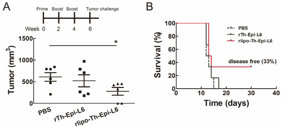 Figure 7. Immunization with rlipo-Th-Epi-L6 inhibited tumor growth and prolonged disease-free survival time. (A) C57BL/6 mice were immunized (n = 6, per group) by injecting the indicated recombinant proteins 3 times at 2-week intervals, and then they were subcutaneously inoculated with EL4/L6 thymoma cells (1 × 105/mouse). The tumor volumes were measured 3 times per week. The graphs show the mean ± SEM on day 12 after tumor challenge. * p < 0.05 by t-test. (B) The disease-free survival rates were analyzed.
