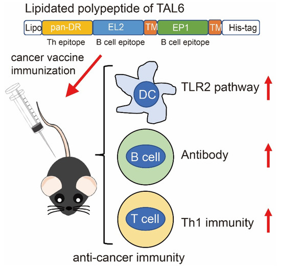 In this study, a lipidated TAL6 polyepitope protein that elicits both cellular (Th1) and humoral (Th2) immune responses was developed. We demonstrated that rlipo-Th-Epi-L6 optimally stimulated TLR2 signaling and further activated BM-DCs. Mice vaccinated with the lipidated polyepitope protein exhibited T helper 1 cell immunity for antigen-specific antibody production. Moreover, this vaccination induced antigen-specific T cell responses. Combining the effects of both humoral and cellular immune responses, this vaccination strategy reduced tumor size in mice and prolonged disease-free survival (Figure 8).