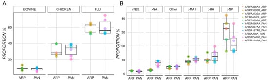 Protein composition in Pandemrix versus Arepanrix. (A) Boxplots for each type of protein, Table 1. (B) This figure shows the relative proportion or concentration of each protein type within each vaccine for peptide fragments classified as influenza proteins.