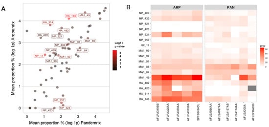 Mean mutation proportion in Arepanrix versus Pandemrix. (A) Each data point represents a specific mutated amino acid. This scatterplot maps the log-transformed mean mutation proportion in Pandemrix on the x-axis against log-transformed mean mutation proportion in Arepanrix on the y-axis. Calculated from a two-tailed Student’s t-test; the p-value of each data point indicates how significantly different the mutation is between vaccines. As data points are colored based on their p-value, the redder on the gradient scale, the more significant the mutation is in regard to differentiating Pandemrix and Arepanrix. (B) The heatmap is indicating the actual mutational proportion with the y-axis showing the mutated positions and the x-axis showing the vaccine lots.