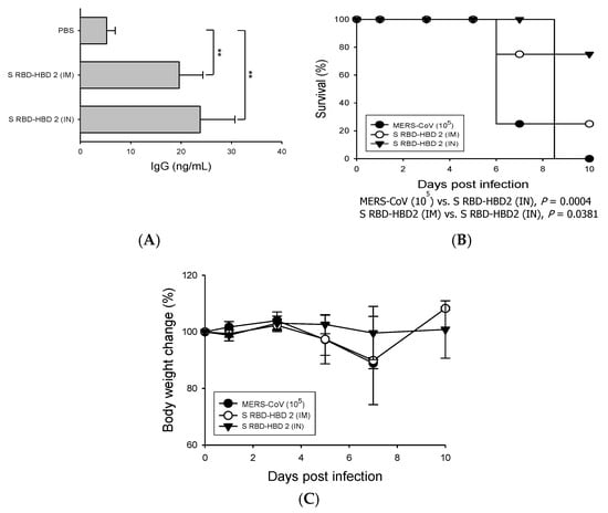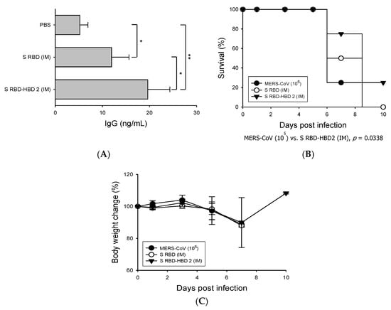 Kim J, Yang YL, Jeong Y, Jang Y-S. Conjugation of Human β-Defensin 2 to Spike Protein Receptor-Binding Domain Induces Antigen-Specific Protective Immunity against Middle East Respiratory Syndrome Coronavirus Infection in Human Dipeptidyl Peptidase 4 Transgenic Mice. Vaccines. 2020; 8(4):635. https://doi.org/10.3390/vaccines8040635