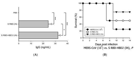 We also evaluated the ability of low-dose S RBD-HBD 2 intranasal administration to induce Ag-specific Ab responses and protect hDPP4-Tg mice against intranasal challenge with MERS-CoV (Figure 5). The serum levels of S RBD-specific IgG were significantly higher in mice intranasally immunized with S RBD-HBD 2 than in control mice or mice immunized with S RBD alone (p < 0.001 and p < 0.05; Figure 5A). Importantly, S-RBD-HBD-2-immunized mice exhibited a markedly improved survival rate (75%) at 10 dpi with MERS-CoV compared to control mice (25%) and mice immunized with S RBD alone (Figure 5B). In contrast to S RBD alone- and S-RBD-HBD-2-immunized mice, MERS-CoV-infected control mice showed a modest weight loss until eight dpi (Figure 5C). No profound weight loss was observed in S RBD alone- and S-RBD-HBD-2-immunized hDPP4-Tg mice following MERS-CoV infection. These results suggest that the intranasal immunization of S RBD-HBD 2 induces potent mucosal IgA responses, reinforcing local and systemic immunity, and preventing MERS-CoV infection.
