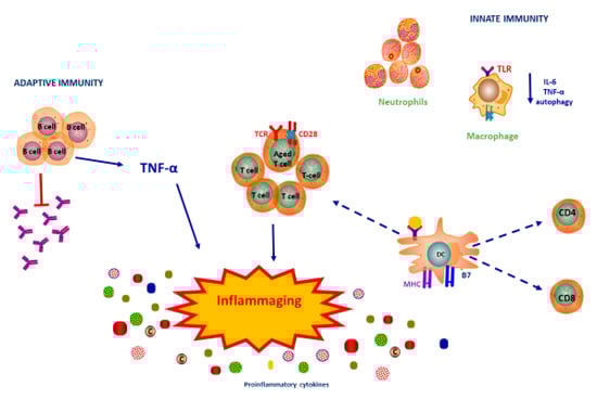As mentioned previously, inflammaging refers to high self-reactivity in the elderly, resulting in a typical chronic, low-grade systemic inflammation, mainly driven by adaptive immunity, particularly altered T-lymphocytes, as discussed below [40]. Inflammaging is closely associated to aging, thus it can be, to some extent, considered as the other side of immunosenescence; indeed, the two processes are closely linked [41].