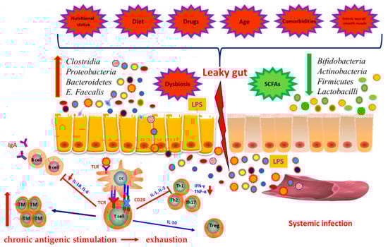 Interplay between microbiota and immunity in elderly. Changes in gut microbiota occur in the elderly. A condition known as “leaky gut” is associated to many diseases and common in the elderly. It is determined by alteration in several factors as diet, nutritional status, use of antibiotics or other drugs, the presence of comorbidities and the dysbiosis. Furthermore, due to leaky gut, gut microbiota can pass the gut barrier and enter the blood stream, a key step in the process of inflammaging. Furthermore, the continuous chronic antigenic stimulation causes the increased number of memory T cells. A consequence of chronic stimulation is exhaustion. Abbreviations: TM, memory T cells; DC, dendritic cells; LPS, lipopolysaccharide.