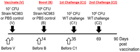 Previous work demonstrated that strain NC983 was unable to cause lethal infection in C57BL/6 mice when inoculated through either peroral or intraperitoneal routes [44]. This evidence suggested that NC983 may be attenuated in mice and warranted further studies to test its ability to confer protective immunity in mice. Therefore, a vaccination protocol was developed to test the ability of NC983 to protect against challenge with virulent S. Typhimurium (Figure 1). This protocol utilized oral inoculation (i.e., vaccination and boost) of mice with either strain NC983 (vaccine group) or a PBS control. At 35 days post-vaccination (dpv), all mice were challenged with the virulent strain of S. Typhimurium ATCC 14028s, as outlined in Materials and Methods and Figure 1. The percent survival of mice was recorded for the duration of the study, bacterial burden of the challenge strain in vaccinated mice and anti-Salmonella IgG in vaccinated mice were determined at the end of the study (Figure 3).