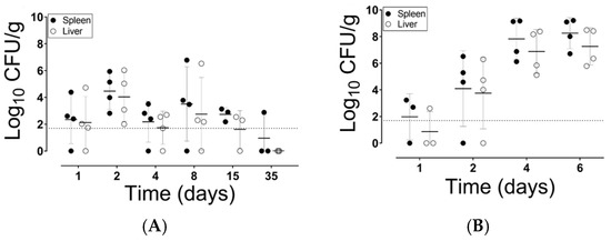 The lethal dose required to kill 50% of animals (LD50) for S. Typhimurium ATCC 14028s was determined under our conditions. Four groups of mice (four mice per group) each received an oral dose of 3.5 × 101, 3.5 × 102, 3.5 × 103, or 3.5 × 104 CFU/mouse. Mice were monitored for 14 days and the LD50 was calculated from 10 day survival data according to [46,47]. The LD50 was ~103 CFU per C57BL/6 mouse, and a similar value was used for BALB/c mice.