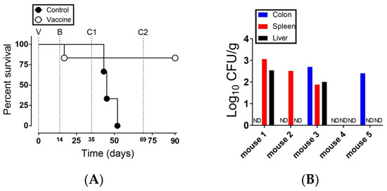 The vaccination protocol was repeated (vaccine experiment no. 2) with another Salmonella sensitive strain of mice (BALB/c) to ensure results from C57BL/6 were not strain specific. In this experiment, a preliminary LD50 for the BALB/c showed that it was slightly lower than that of the C57BL/6 mice. However, to be on the safe side, we used the same LD50 as that for the C57BL/6. Also, the responses of individual mice were measured over time in a longitudinal approach (Figure 4). At 35 dpv, the BALB/c mice received on oral dose of the virulent strain, NC1040 (6.4 × 104 CFU/mouse). By 7 days post challenge (C1, or 42 dpv), all control mice had died or required euthanasia (Figure 4A).
