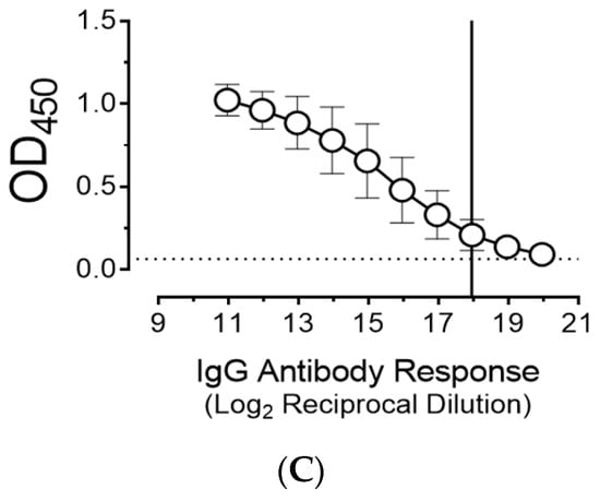 To measure the IgG response to NC983, serum was obtained through tail bleeding at one day prior to vaccination, boosting, and the first challenge (Figure 1). The mean endpoint titer taken before the boosting dose (13 dpv, before B) was 1:100 (dotted line, FDR adjusted p value = 0.031; Figure 4C). The mean endpoint titer after vaccination and boosting was 1: 3200 (solid line, FDR adjusted p-value = 0.018; Figure 4C).