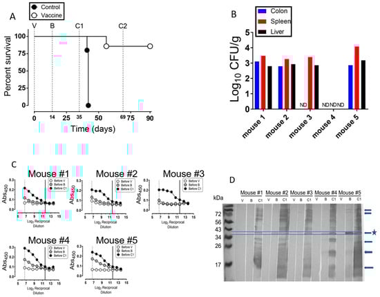 Serum samples from individual mice were probed against whole cell lysates from S. Typhimurium by immunoblotting (Figure 4D). The data showed that serum taken before vaccination had no cross reactivity to S. Typhimurium antigens (lanes marked V). However, after vaccination 3 out of 5 mice showed a cross reactivity band at ~40 kDa (lanes marked B); but after the second inoculation (boosting) all mice showed multiple cross reactivity bands (lanes marked C1). Clearly, there was significant increase in cross reactivity to S. Typhimurium antigens from all mice at the C1 time point (i.e., just before the challenge) (Figure 4D). Indeed, further studies are needed to identify the different S. Typhimurium antigens reacting with the antibodies produced in the immunized mice.