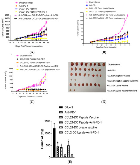 However, the recurred tumors grew extremely slowly not exceeding at 25.6–86.6 mm3. The cured mice rejected a secondary tumor challenge and remained tumor-free (Table 1). Similarly, tumor lysate pulsed CCL21-DC vaccine administered prior to combined therapy led to 90% tumor eradication. Individual depletion of CD4 T cells, CD8 T cells (Figure 1A,B) and CXCL9, CXCL10 (Figure 1C), abrogated the anti-tumor activity of combined therapy. Mice that exhibited treatment-induced tumor eradication, rejected a secondary tumor challenge demonstrating long term immunological memory (Table 1). Combined therapy caused 21-fold tumor weight reduction in comparison to 3-fold by monotherapy (Figure 1D,E). DC peptide, DC tumor lysate, Control vector (CV)-DC peptide plus anti-PD-1 and CV-DC tumor lysate vaccine plus anti-PD-1 caused 10% tumor eradication (data not shown).