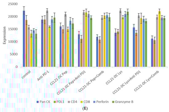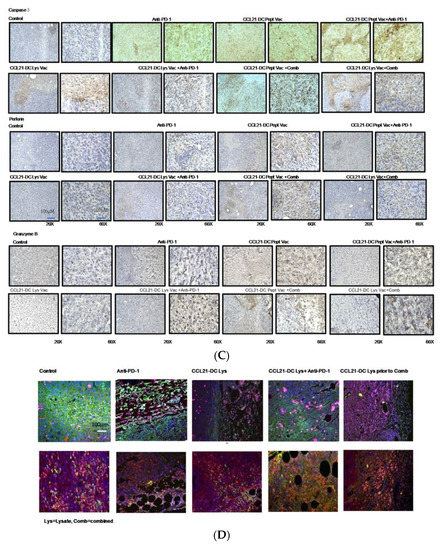 Figure 2B: TILs from mice treated with sequential therapy with vaccine prior to combined therapy had the greatest lytic activity. There was increased CD4 T cells (3-fold), CD8 T cells (10-fold), B cells (13-fold), IFN γ (11- fold), TNF α (2-fold), perforin (3-fold), granzyme B (2- fold), INOS (2-fold), Arginase (2-fold), CXCR3 (7- fold), CXCL9 (5-fold), CXCL10 (6-fold). DC were increased according to the following markers (IL3ra, Itgam, Anpep, Sell, CD68) in the CCL21-DC peptide vaccine plus anti-PD-1 treatment in comparison to control by RNA sequencing. There was increase expression of VISTA in the TME following combined therapy (Table 1).