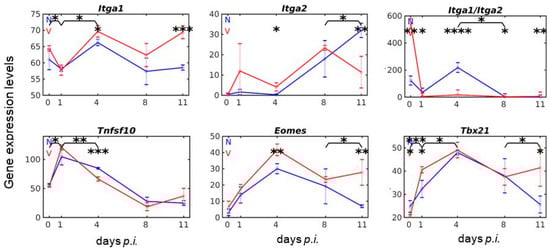 Time courses of hepatic expression of genes associated with liver-resistant natural killer (lrNK) cells and conventional natural killer (cNK) cells. RNA was isolated from individual livers prepared from vaccination-protected (V, red) and non-vaccinated (N, blue) mice infected with Plasmodium chabaudi blood-stage malaria on days 0, 1, 4, 8, and 11 p.i. Gene expression levels in linear scale are plotted as the means of three microarrays ± SD. The number of “*” marks over interval lines between sampling points and over the sampling points indicate statistical significance of corresponding intervals and of given sampling points, respectively, between vaccinated and non-vaccinated mice: * p < 0.05; ** p < 0.01; *** p < 0.001; **** p < 0.0001.
