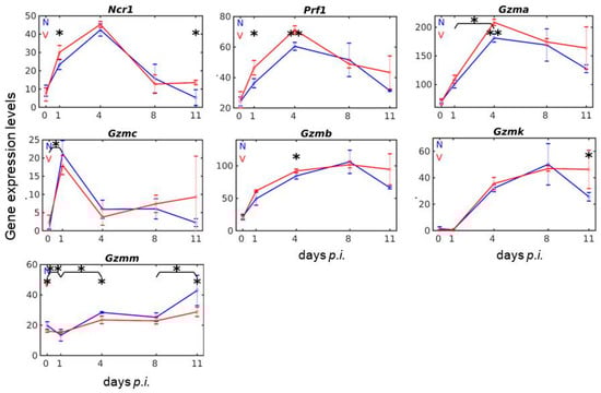 Expression trajectories of genes encoding cytolytic effector molecules in the liver of vaccinated and non-vaccinated mice. RNA was isolated from individual livers prepared from vaccination-protected (V, red) and non-vaccinated (N, blue) mice infected with P. chabaudi blood-stage malaria on days 0, 1, 4, 8, and 11 p.i. Gene expression levels in linear scale are plotted as the means of three microarrays ± SD. The number of “*” marks over interval lines between two sampling points and over the sampling points indicate statistical significance of corresponding intervals and of given sampling points, respectively, between vaccinated and non-vaccinated mice: * p < 0.05; ** p < 0.01.