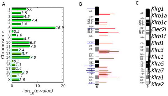 To search for chromosomes statistically enriched with up-regulated DEGs in the liver of vaccinated mice in relation to non-vaccinated mice, a chromosome landscape analysis was performed at early patency on day 4 p.i., when P. chabaudi-infected erythrocytes begin to appear in peripheral blood of mice. Figure 3A shows that chromosome 6 is the most highly statistically significantly enriched (p = 1.26 × 10−17) with DEGs, whose expression is up-regulated in vaccination-protected mice. Visual inspection of the ideogram of chromosome 6 with both up- and down-regulated DEGs point out the existence of potential clusters of up-regulated DEGs (Figure 3B). To identify these clusters, we performed one-dimensional clustering that searched for groups of gene loci of the up-regulated genes [52]. Four clusters were identified to be distributed in cytobands C3-D1, F2, F3, and G1. The cluster of cytoband F3 is entirely populated with genes encoding proteins of the NKC (Figure 3C).