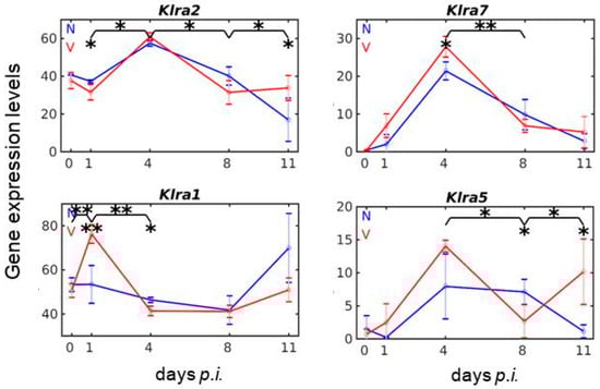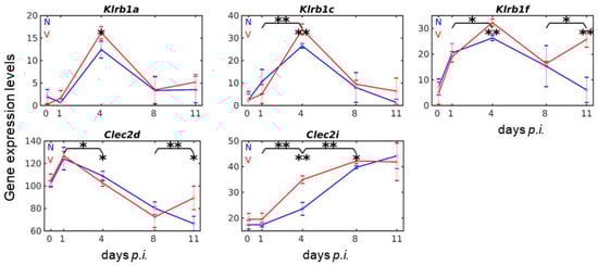 Expression trajectories of genes encoding members of the KLRA receptor family involved in MHCIa-dependent tissue surveillance. RNA was isolated from individual livers prepared from vaccination-protected (V, red) and non-vaccinated (N, blue) mice infected with P. chabaudi blood-stage malaria on days 0, 1, 4, 8, and 11 p.i. Gene expression levels in linear scale are plotted as the means of three microarrays ± SD. The number of “*” marks over interval lines between two sampling points and over the sampling points, respectively, indicate statistical significance of two corresponding intervals and of a given sampling point, respectively, between vaccinated and non-vaccinated mice: * p < 0.05; ** p < 0.01.