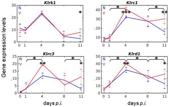 Time series of NK-expressed genes encoding KLR receptors involved in MHCIb-dependent tissue surveillance. RNA was isolated from individual livers prepared from vaccination-protected (V, red) and non-vaccinated (N, blue) mice infected with P. chabaudi blood-stage malaria on days 0, 1, 4, 8, and 11 p.i. Gene expression levels in linear scale are plotted as the means of three microarrays ± SD. The number of “*” marks over interval lines between two sampling points and over a given sampling point indicate statistical significance between two corresponding intervals and between a given sampling point, respectively, between vaccinated and non-vaccinated mice: * p < 0.05; ** p < 0.01; *** p < 0.001.
