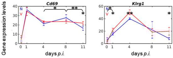 Expression trajectories of Cd69 and Klrg1 in the liver of vaccination-protected and non-protected mice. RNA was isolated from individual livers prepared from vaccination-protected (V, red) and non-vaccinated (N, blue) mice infected with P. chabaudi blood-stage malaria on days 0, 1, 4, 8, and 11 p.i. Gene expression levels in linear scale are plotted as the means of three microarrays ± SD. The number of “*” marks over interval lines connecting two sampling points and over sampling points indicate statistical significance of corresponding intervals and of a given sampling point, respectively, between vaccinated and non-vaccinated mice: * p < 0.05; ** p < 0.01.