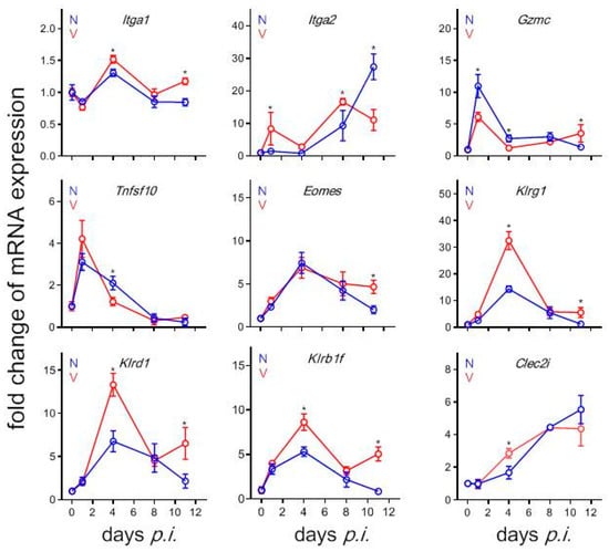 The unrelated Klrk1 exhibits its expression maximum of approximately 24 above normalization level on day 4 p.i. in both non-vaccinated and vaccinated mice. Only towards the end of crisis on day 11 p.i., there is a higher expression of Klrk1 in the liver of vaccinated mice than in non-vaccinated mice. The activating receptor KLRK1 is known to be a master regulator of immune cell responsiveness and to affect all stages of the life cycle of NK cells through modification of NK cell receptor activation thresholds, which plays a role in effector responses on NK cells in the periphery [56,57].