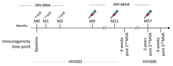 - Joachim, A.; Munseri, P.J.; Nilsson, C.; Bakari, M.; Aboud, S.; Lyamuya, E.F.; Tecleab, T.; Liakina, V.; Scarlatti, G.; Robb, M.L.; et al. Three-Year Durability of Immune Responses Induced by HIV-DNA and HIV-Modified Vaccinia Virus Ankara and Effect of a Late HIV-Modified Vaccinia Virus Ankara Boost in Tanzanian Volunteers. Aids Res. Hum. Retrovir. 2017, 33, 880–888. [Google Scholar] [CrossRef]