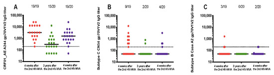 In contrast to the V1V2 CRF01_AE A244-specific responses, the response rate to V1V2 of subtype C CN54 decreased significantly three years after the second HIV-MVA. At the time of the third HIV-MVA, the proportion of vaccinees with antiV1V2 antibodies to subtype C CN54 had declined from 47% (9 out of 19) to 10% (two in 20), p = 0.016. The magnitude in the nine responders was 800 (IQR; 400–2400) four weeks after the second HIV-MVA. The third HIV-MVA did not significantly boost neither the frequency nor the level of subtype C CN54 V1V2-specific IgG antibodies, p = 0.5 (Figure 2B). IgG binding antibody responses to V1V2 of subtype B Case A2 were rare (Figure 2C), and the vaccine did not elicit detectable IgG binding antibodies to subtype C Consensus C V1V2 (Table 2).