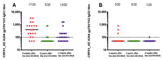 IgG subclass responses to gp70V1V2 protein of CRF01_AE A244. Vaccine-induced IgG1 (A) and IgG3 (B) binding responses to CRF01_AE A244 V1V2 antigen. Antibody responses at four weeks post second HIV-MVA vaccination (V21, response in red circles), three years after the second HIV-MVA immunization (V62, response in green circles) and four weeks after the third HIV-MVA boost (V64, response in purple circles). Horizontal solid lines represent the median antibody titers, while dotted line indicates a cut off for positive values. For graphing purposes, samples with no V1V2 IgG1 and IgG3 binding antibody responses at 1:100 dilutions were arbitrarily assigned a value of 50.